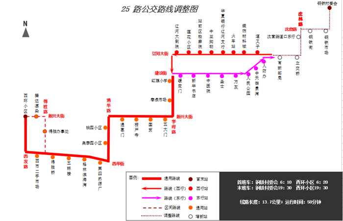 1.線路走向:“西環(huán)小區(qū)”—原線—遼河大街/建設(shè)街(東風(fēng)路)—“立交橋”—莊林路—沈營(yíng)路—“鋼鐵村委會(huì)”。