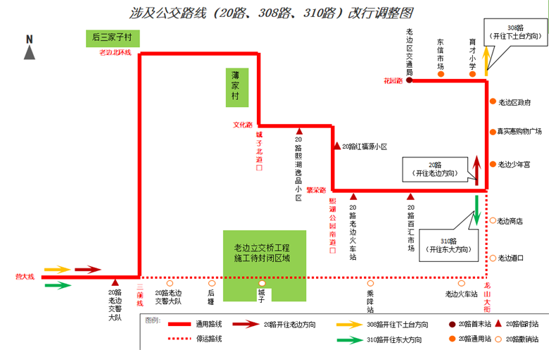 途徑封閉路段參照20路改行路線執(zhí)行,自龍山大街與繁榮路交匯處向北至下土臺(tái)歸到原線路運(yùn)營(yíng)。